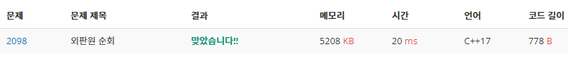 - 모든 노드를 순회하는 최적의 경로는 완전 탐색으로도 해결이 가능하지만 노드의 개수가 10개가 넘어간다면 시간 초과에 걸리게 됩니다. 이 문제는 노드의 최대 개수가 16개이기 때문에 Memoization을 적용해야 합니다.